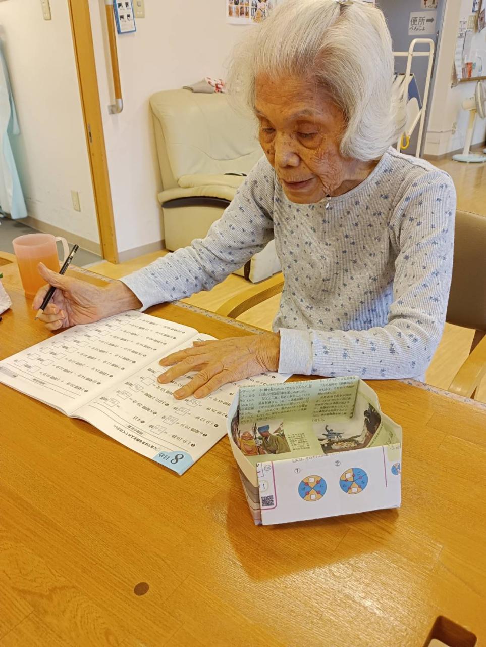 今日は、ご家族様からの差し入れに喜ばれる様子や、大量のチラシを仕分けする様子、計算ドリルに集中される様子がありました♡