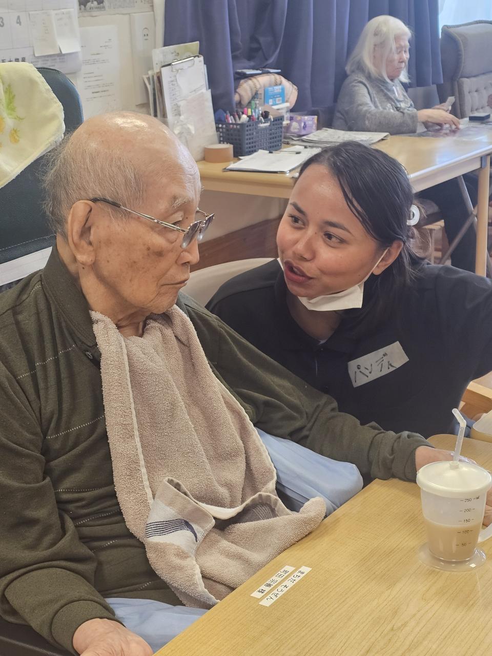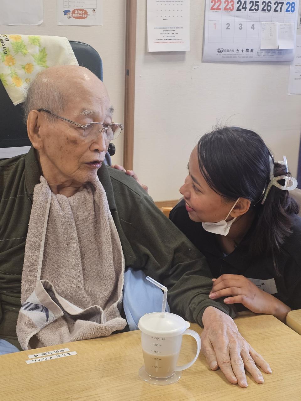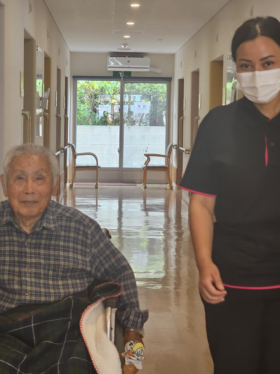 テラスへ外国人実習生が入りました、入居者さんも楽しそうに自己紹介等していました、面会の際は、実習生へも、お声かけお願いいたします。