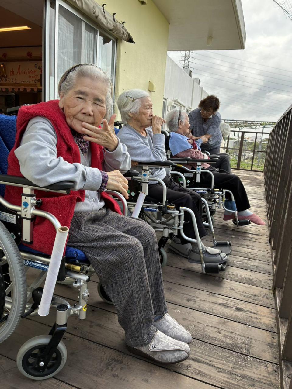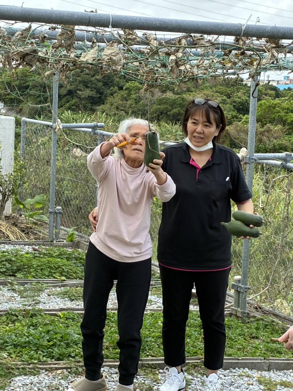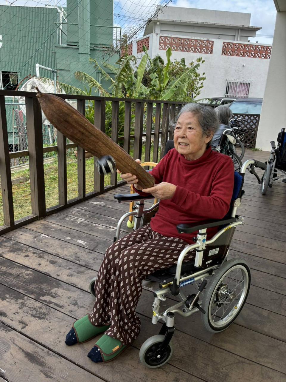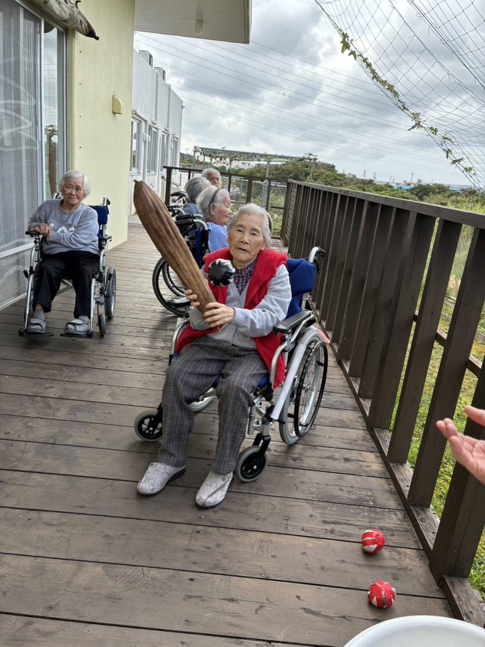 健康チェックのあとは、テラスに出て外気浴♡ヘチマの収穫をしたり、大きくなりすぎたヘチマで遊んだり、ゆんたくする様子がありましたo(^o^)o