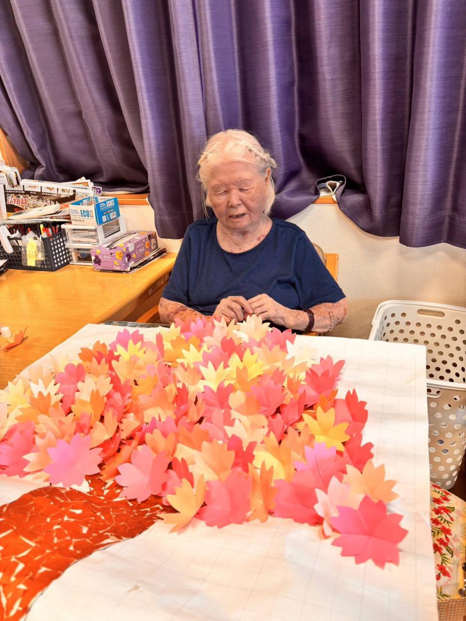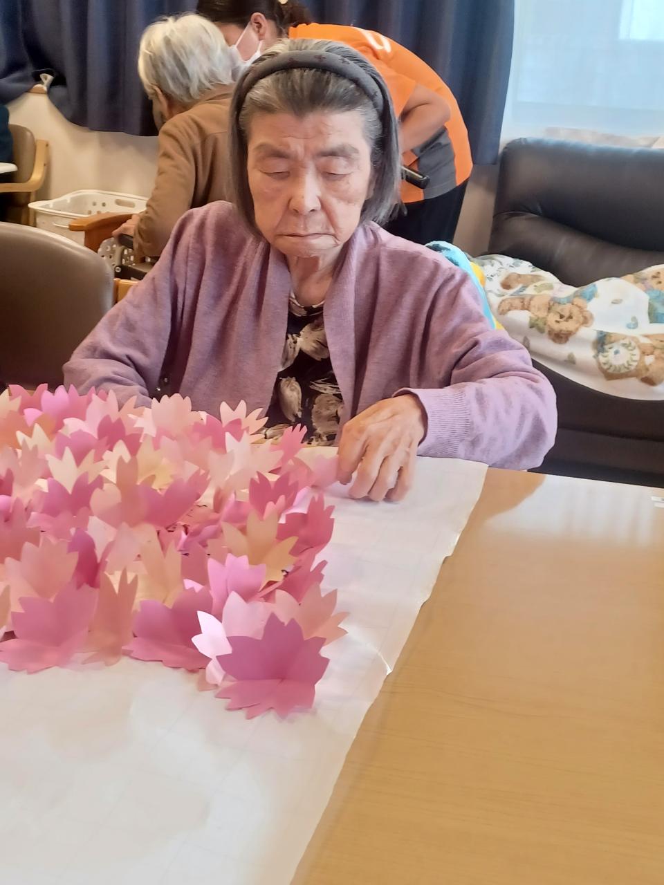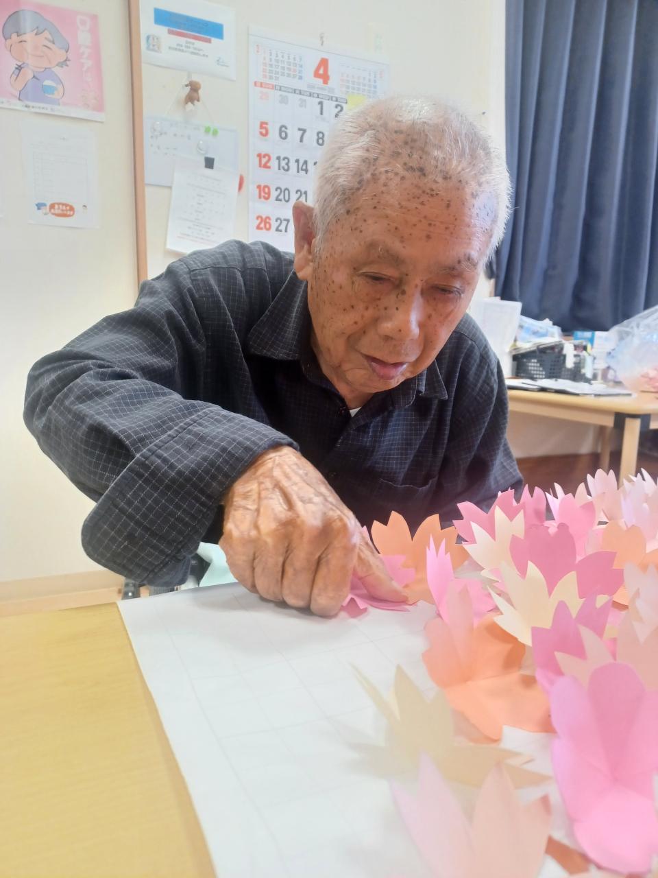 今日は、4月の壁飾りの桜をみんなで作成しましたよ♡