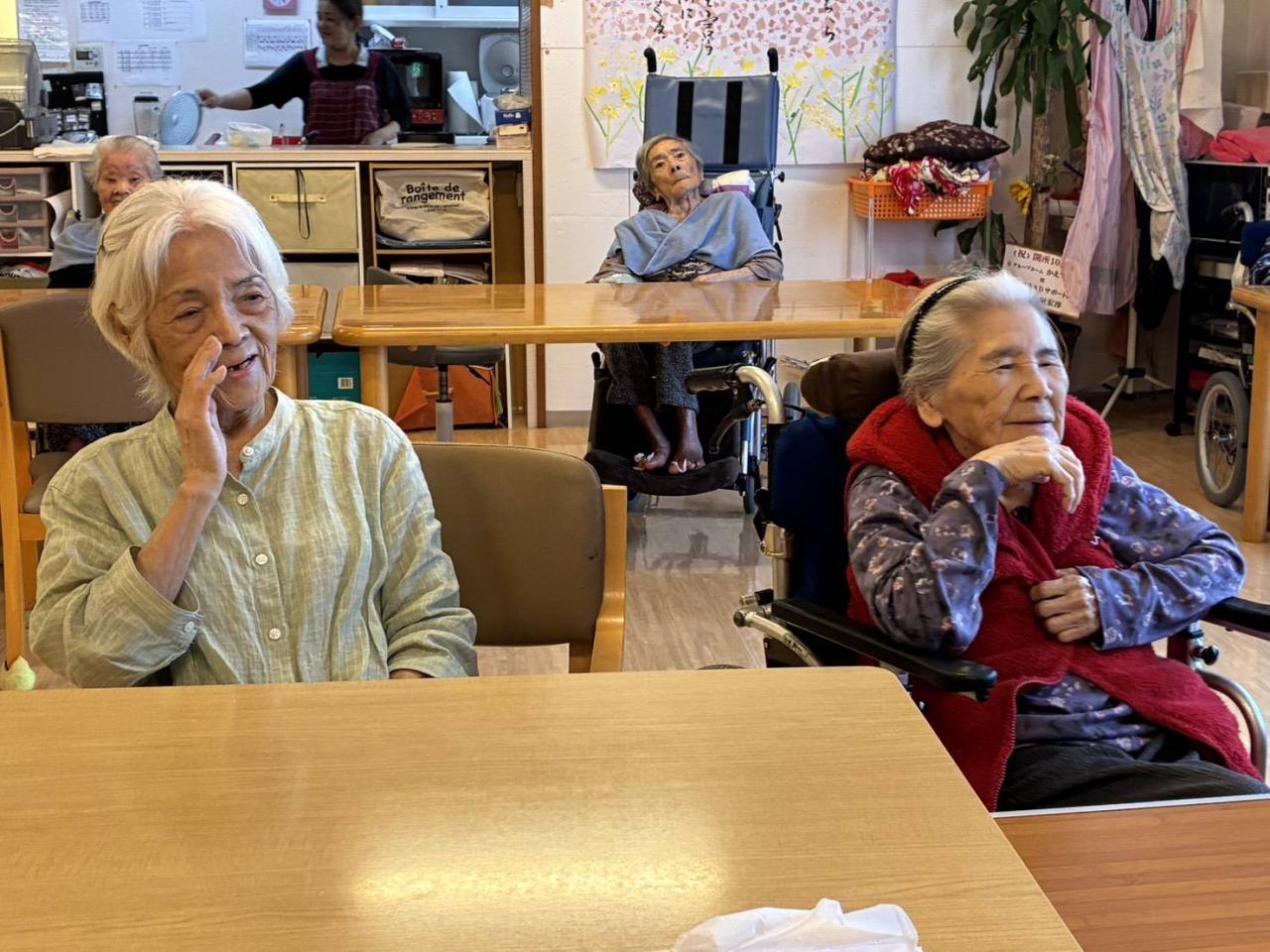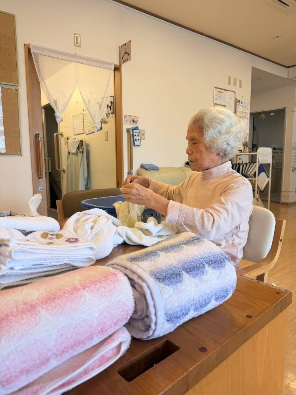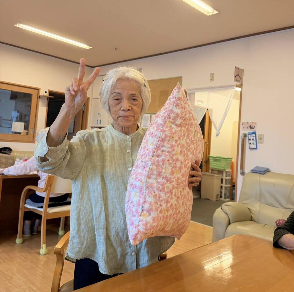 職員と笑い合ったり、手縫いでクッションを完成させたり、全員の洗濯物を黙々と畳まれる場面もありましたo(^o^)o